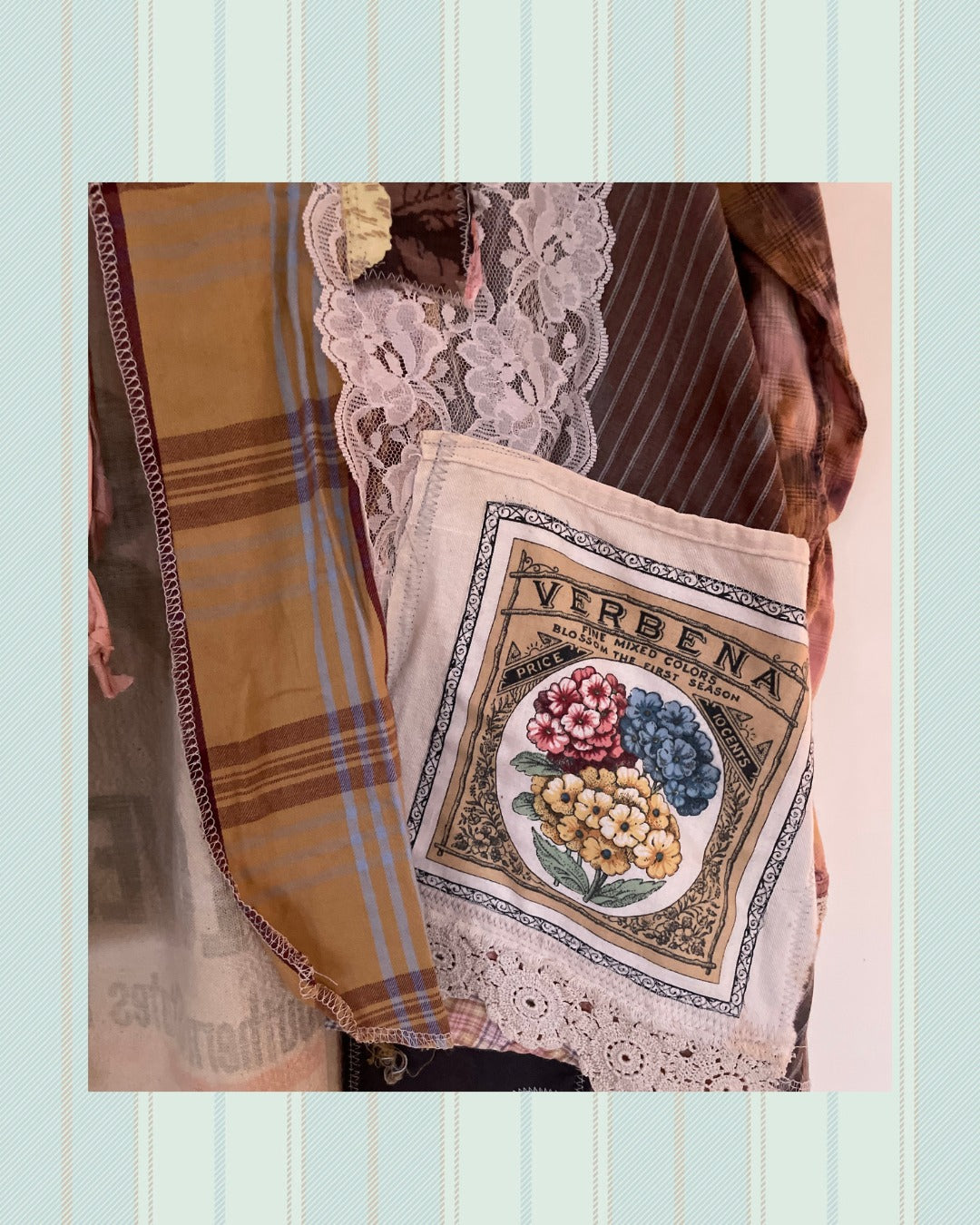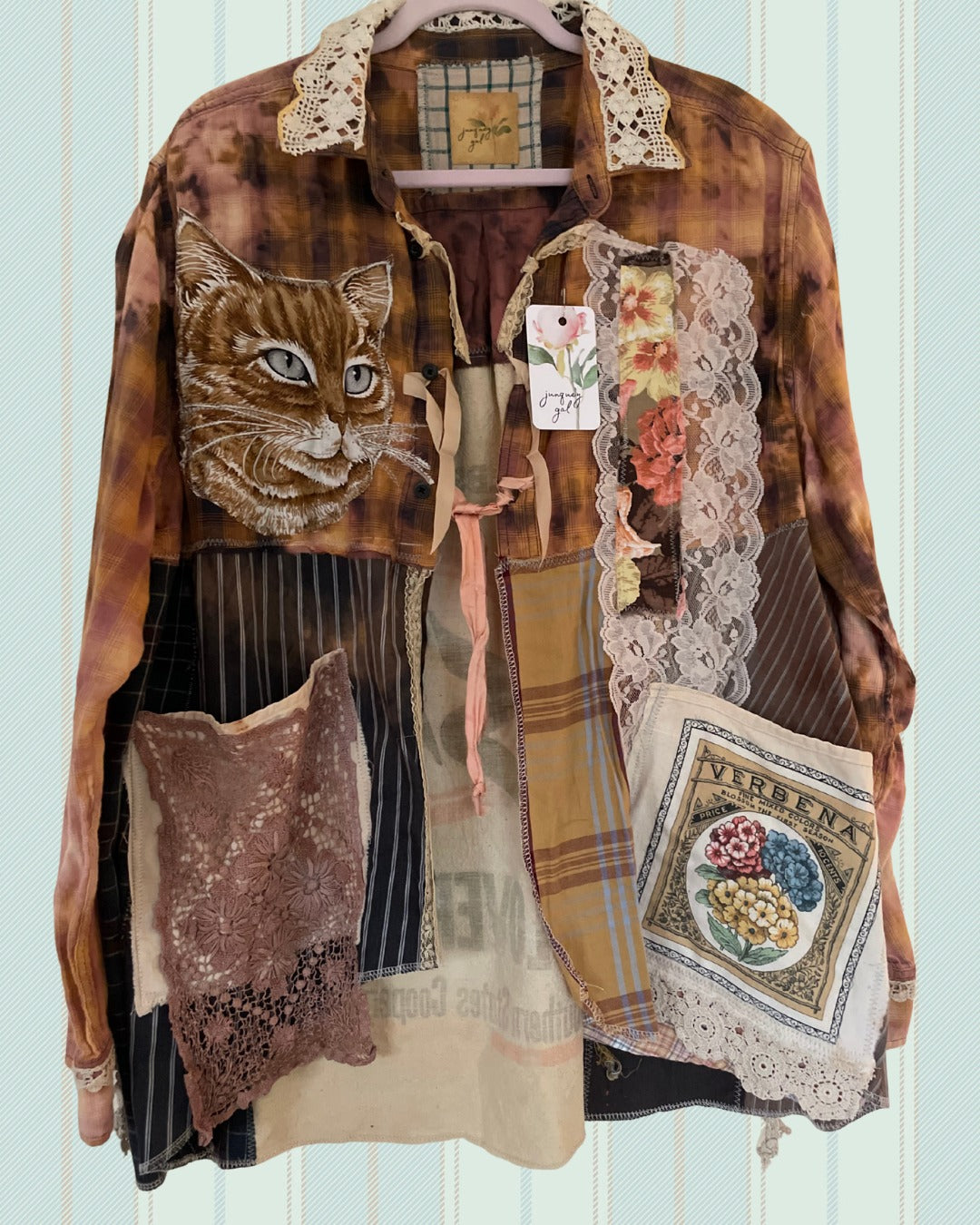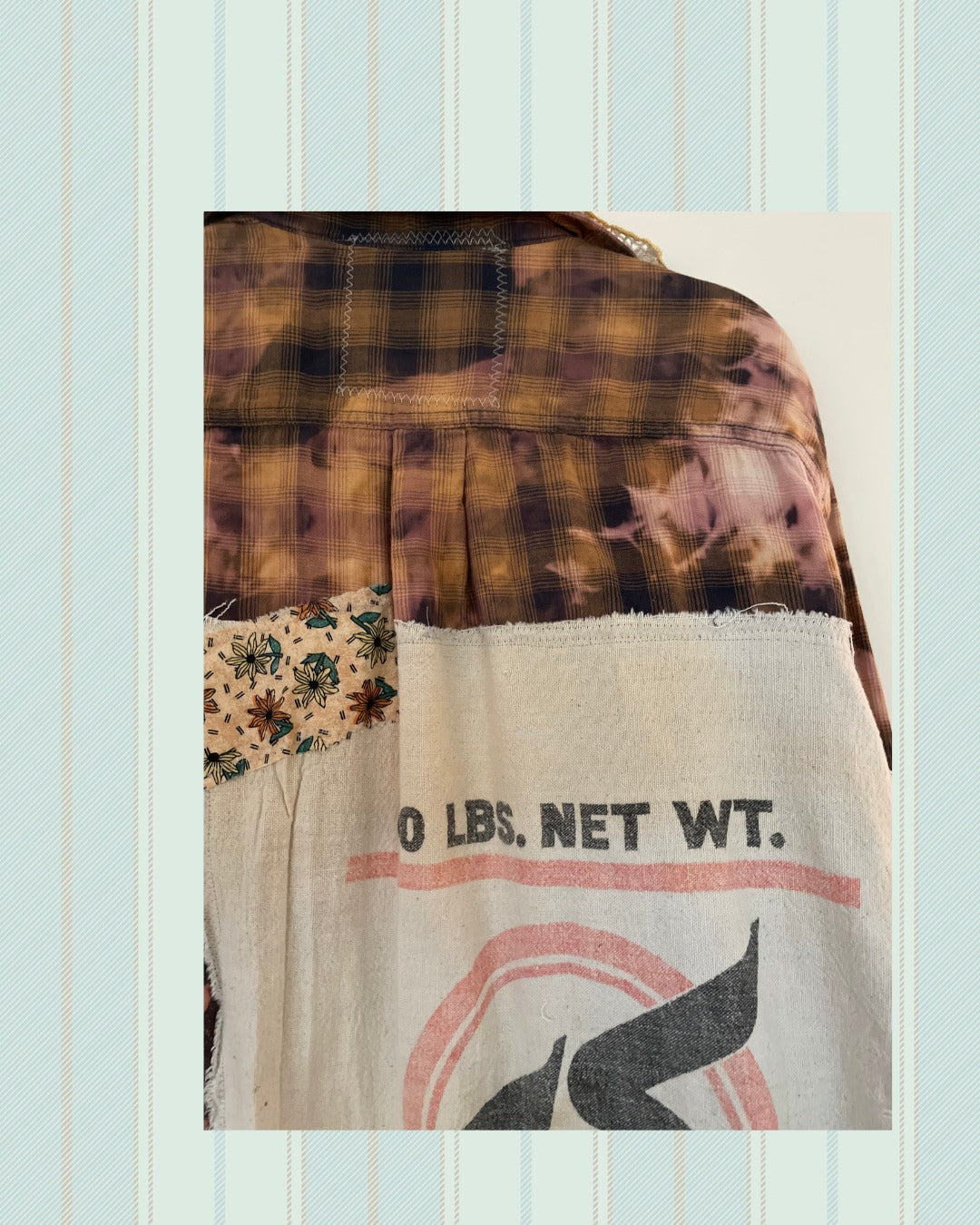 Flannel shirt bleach dyed to pretty rusty hues, authentic clover seed bag / sack and lots of little bits and pieces of fabrics and textures. Not as long as most of our dusters.