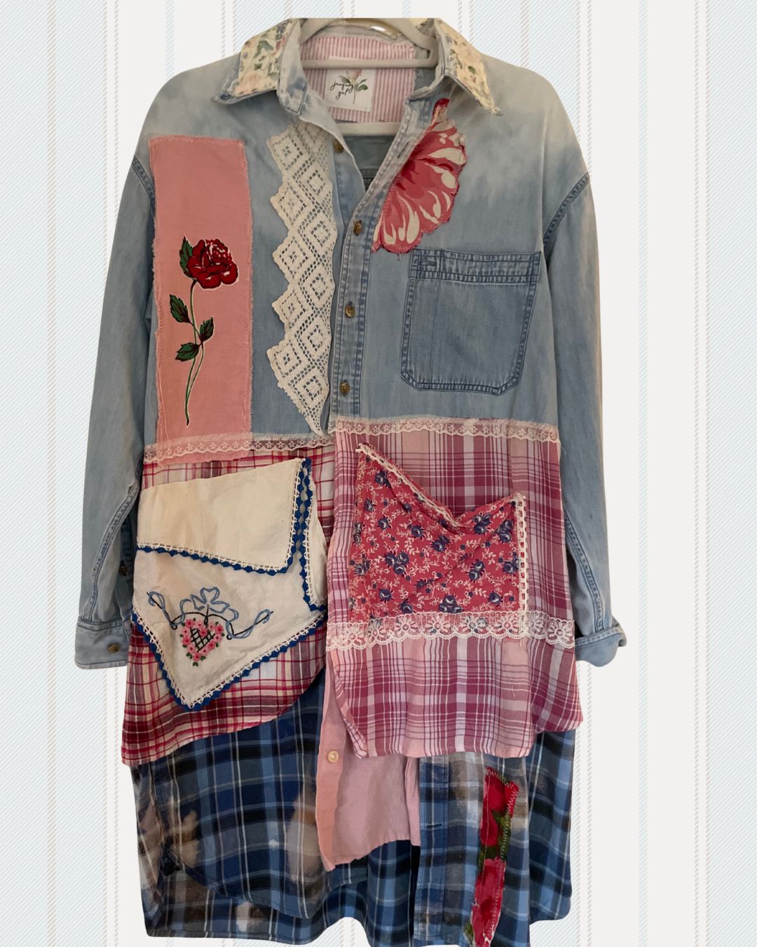 Each item is made from a variety of materials - for recommended care: Your one-of-a-kind JG threads apparel will arrive ready-to-wear and finished with a spritz of starch & lavender.  Hand wash or delicate cycle only – vintage linens are so delicate and the mix of newer & older fabrics & flannel or denim can end up muddied or damaged when washed on a regular cycle.  Line or hang dry, iron as you like, giving care to the delicate lace and mismatch of fabrics. Junquey Gal apparel is not stuffy and equally as pleasing when a bit casually rumpled!