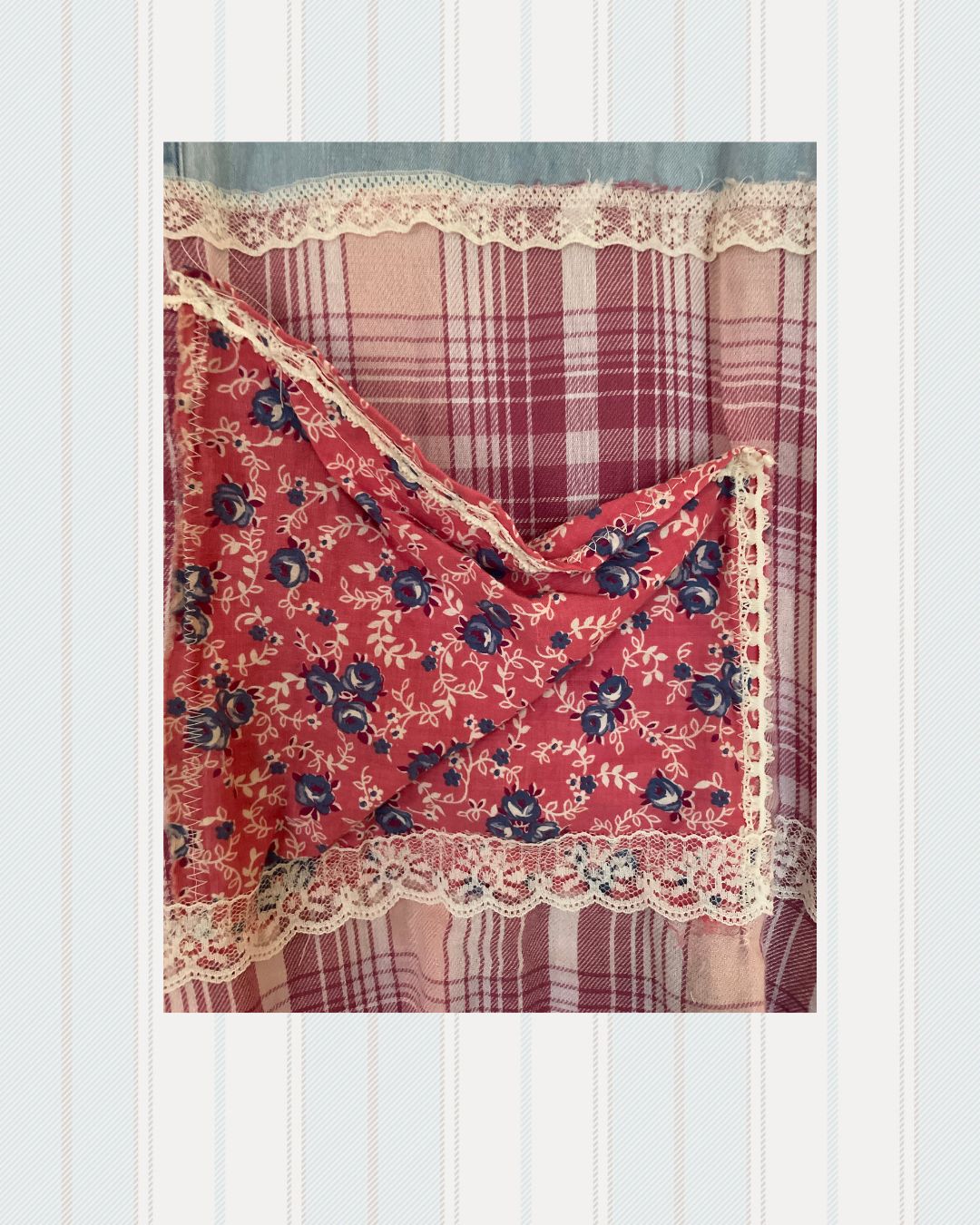 Featuring authentic elements from a vintage handstitched heart and ribbon dresser scarf and a red rose on a willowy stem from a 1950's tablecloth. This is light / medium weight denim with light fading and pink and blue plaid.