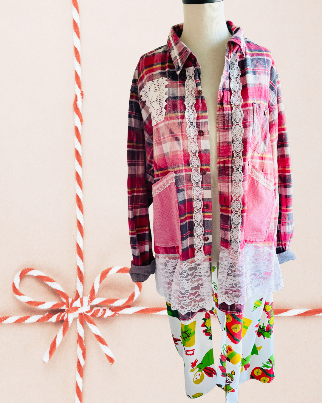 Men's flannel upcycled with light bleaching, and lace accents. An extended hem from a vintage tablecloth which has folk art Santa, ornaments and wreaths - 1960-70's vibe. The back has a piece from a different vintage tablecloth, complete with toadstools and candle tablescape!