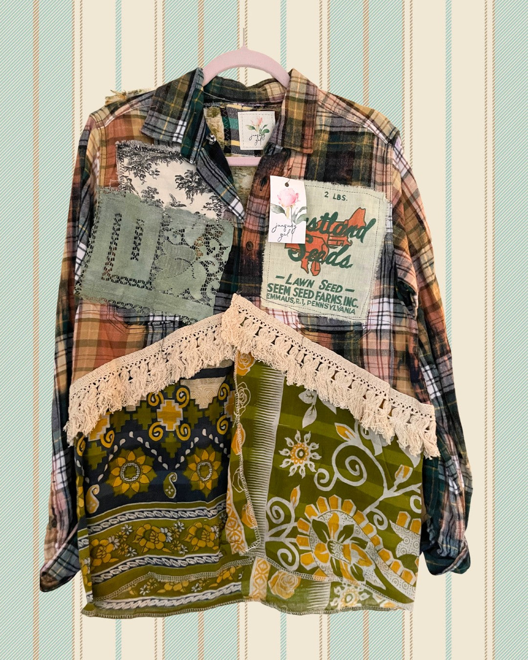 Each item is made from a variety of materials - for recommended care: Your one-of-a-kind JG threads apparel will arrive ready-to-wear and finished with a spritz of starch & lavender.  Hand wash or delicate cycle only – vintage linens are so delicate and the mix of newer & older fabrics & flannel or denim can end up muddied or damaged when washed on a regular cycle.  Line or hang dry, iron as you like, giving care to the delicate lace and mismatch of fabrics. Junquey Gal apparel is not stuffy and equally as pleasing when a bit casually rumpled!