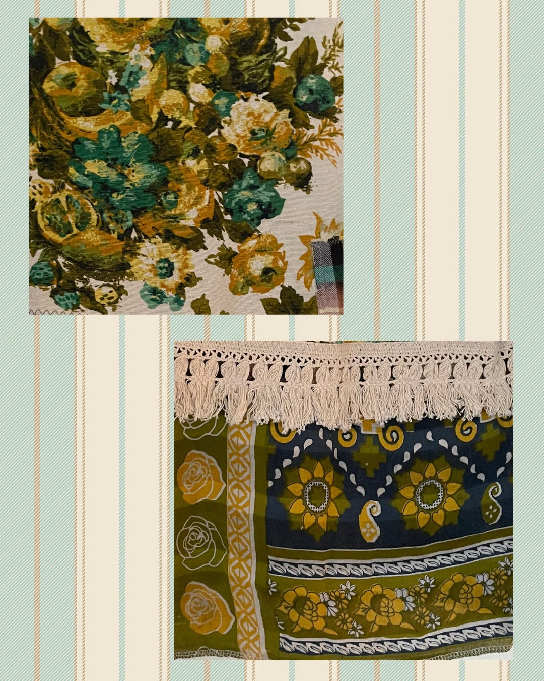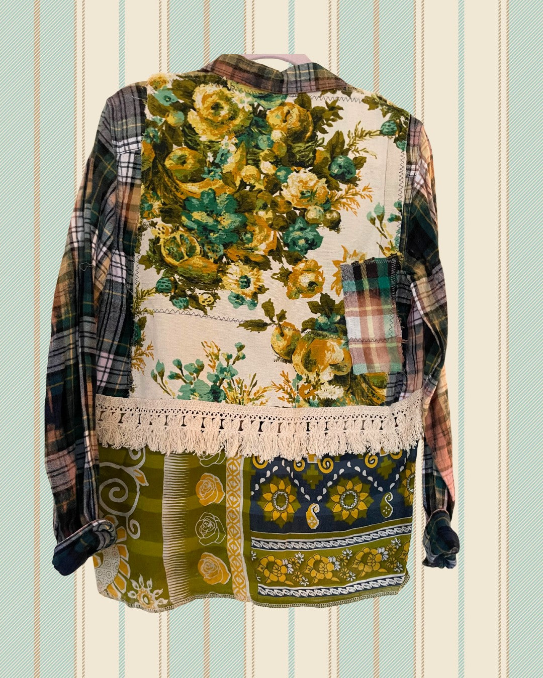 Bleach dyed flannel with a kantha blanket hem, chunky ivory fringe, and swatches of complimentary fabrics. The back has a huge piece of a gorgeous 1970s gold and green floral drapery panel.