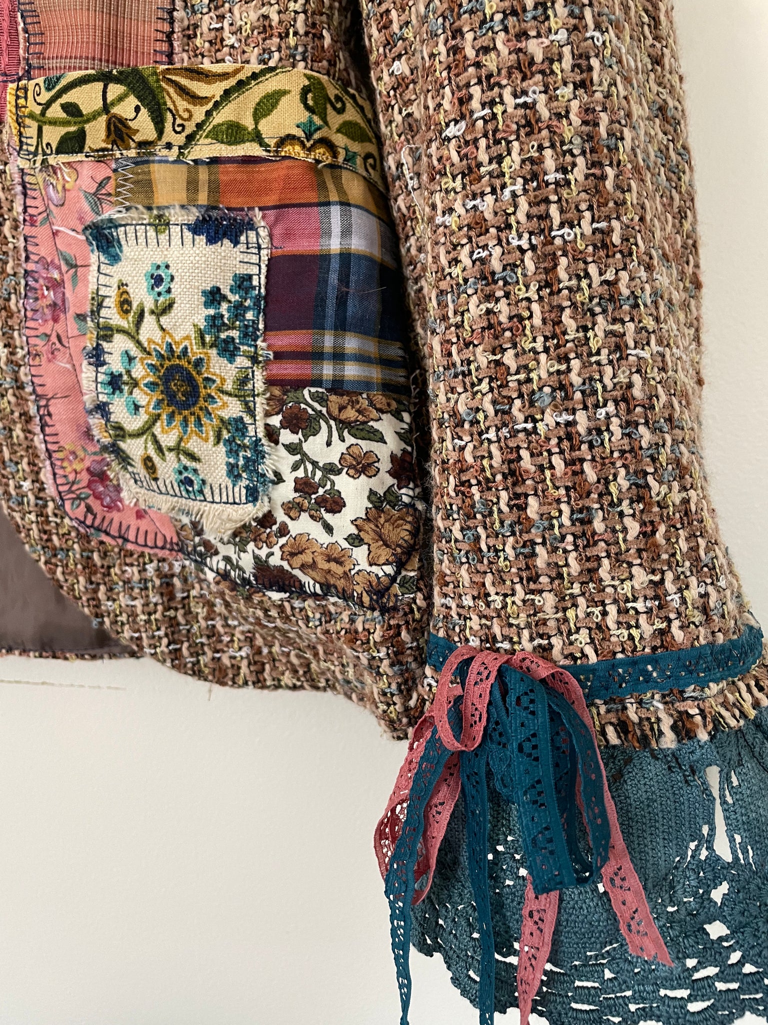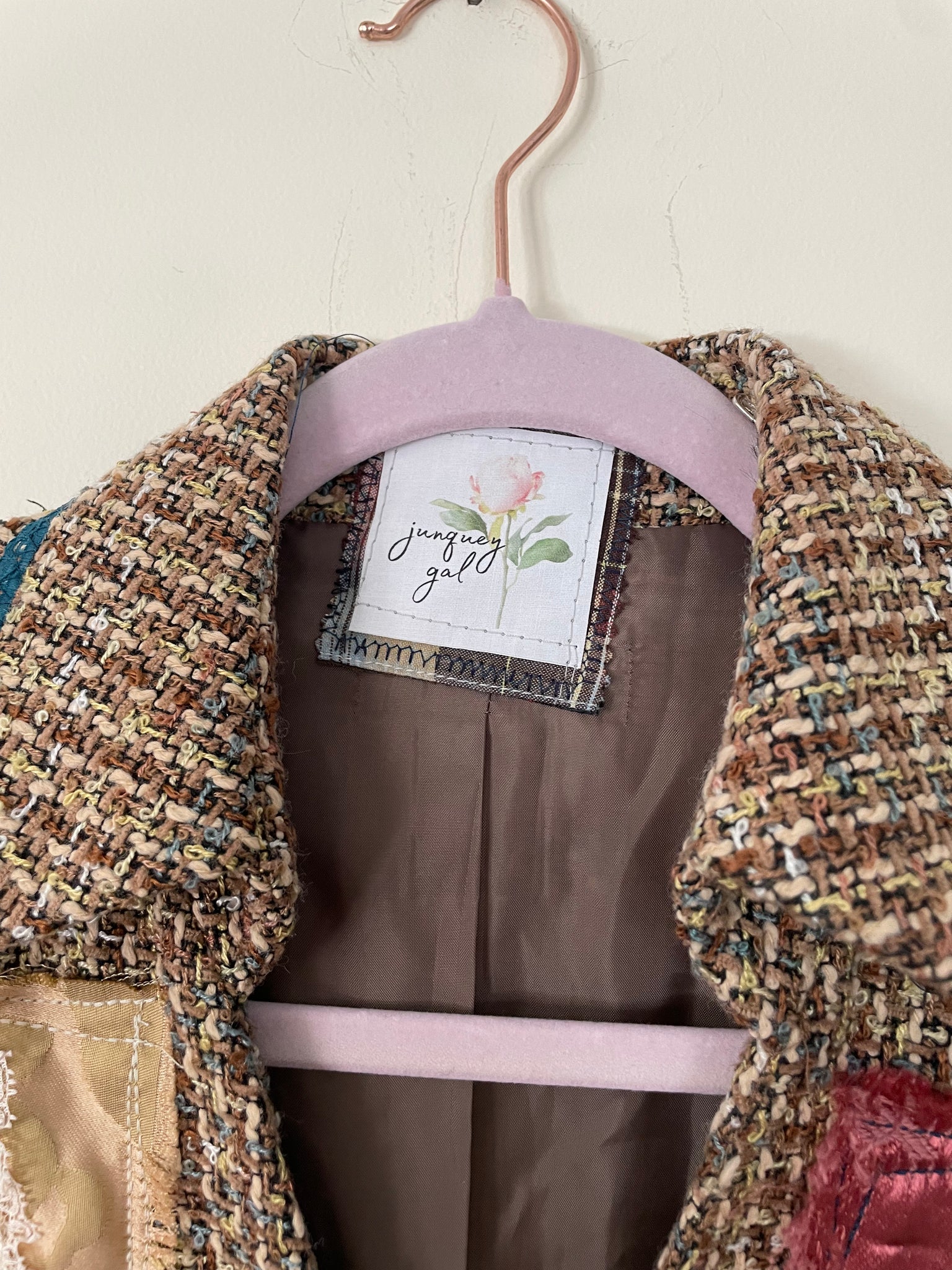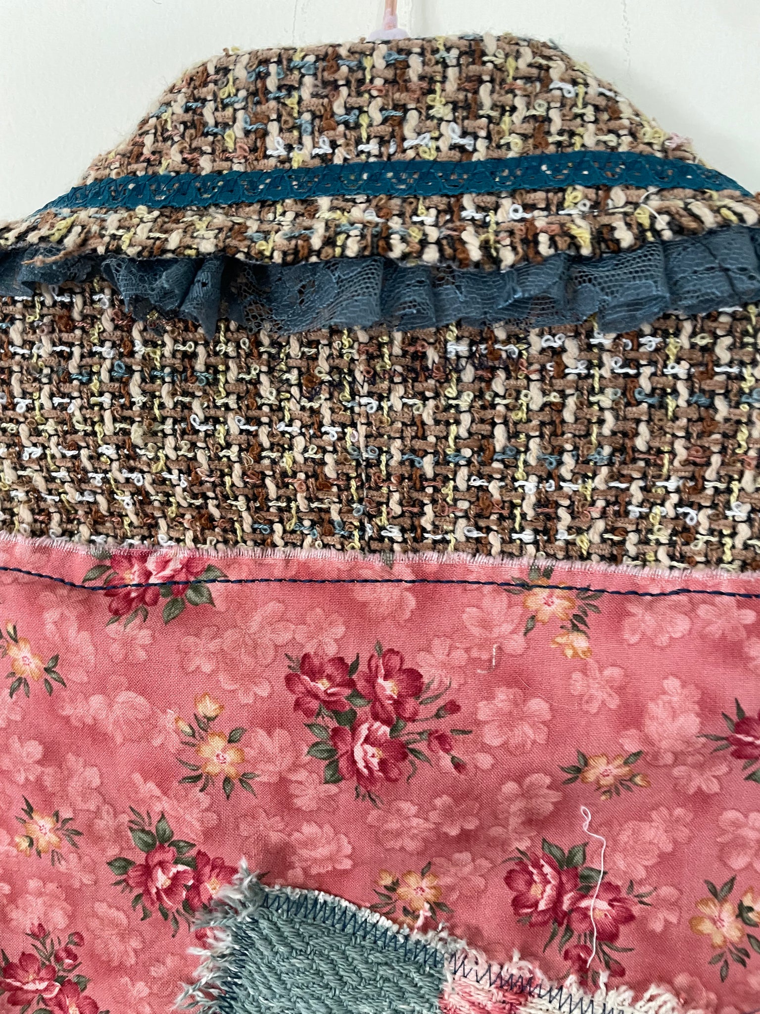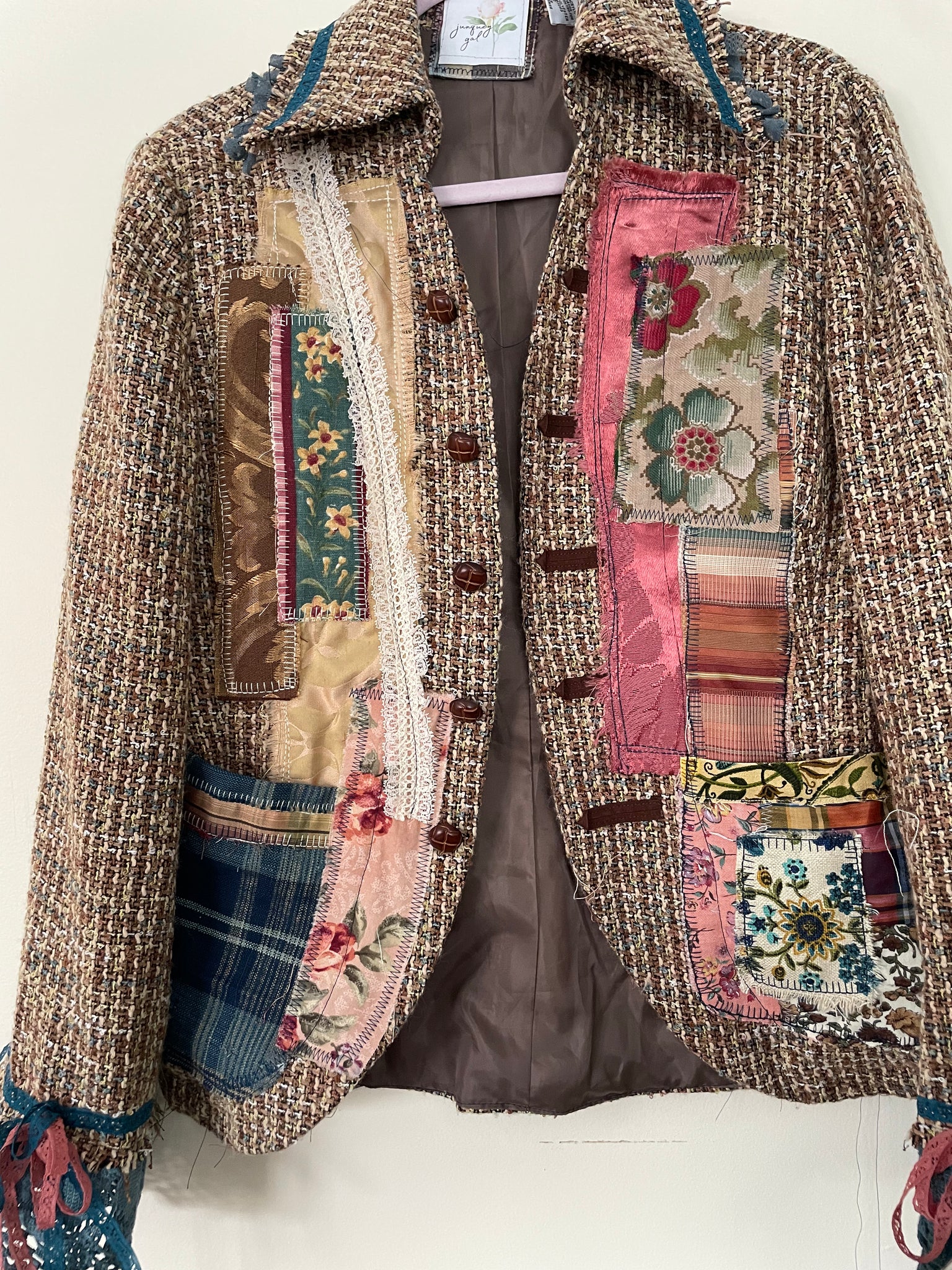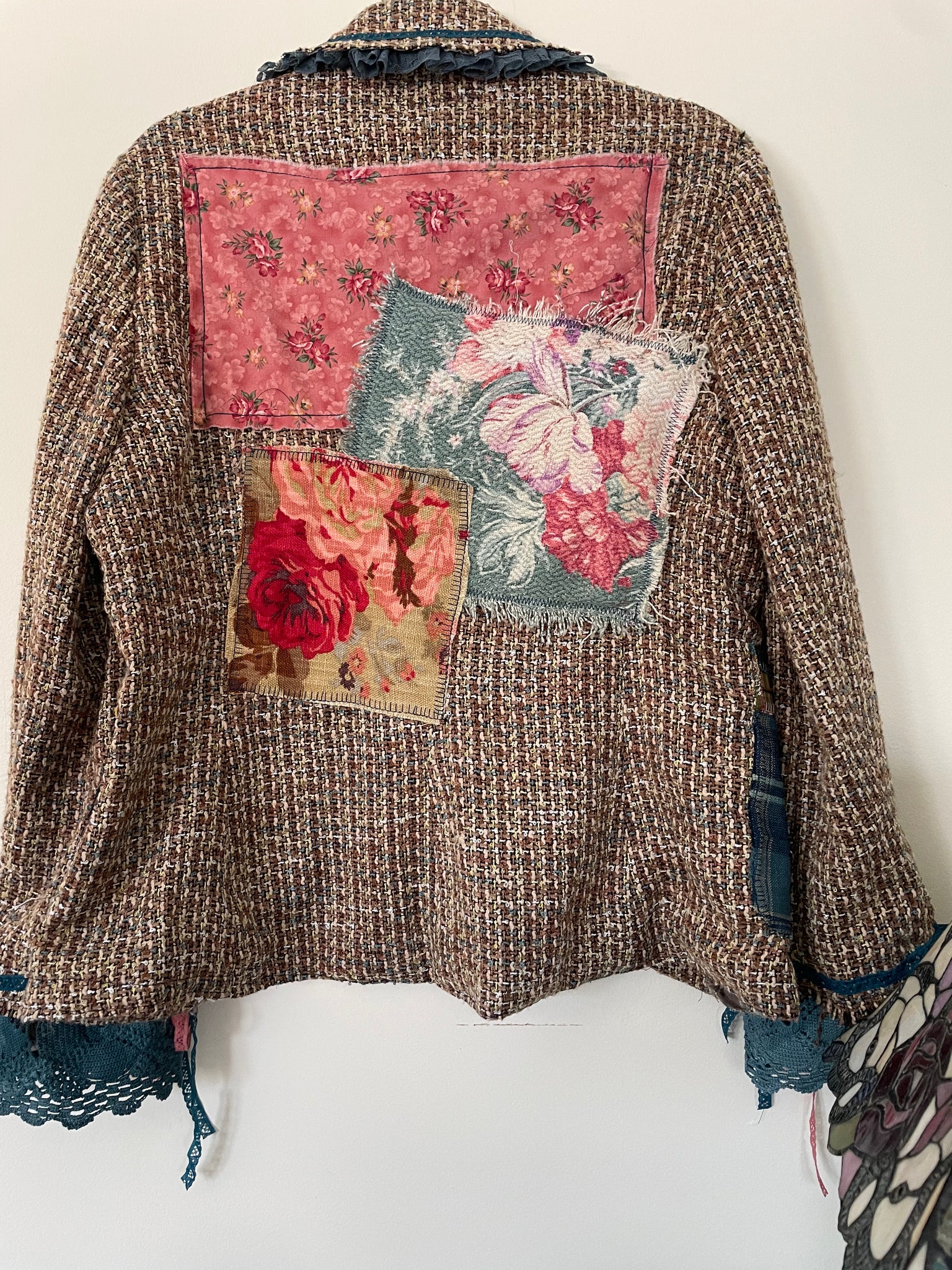 This jacket started as a Newport News size 12. It is a slimmer fit and the buttons are for appearance only; there are hidden hooks if you want to close it a bit. It doesn't close all the way for me and I am a size Large. If you want it close all the way, this may only work up to a Medium to be safe.