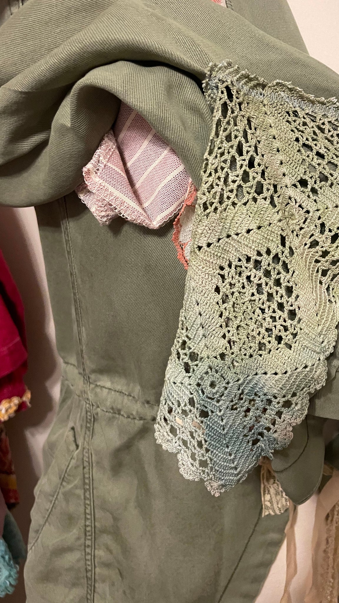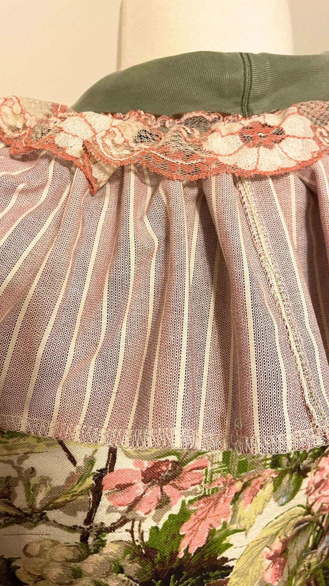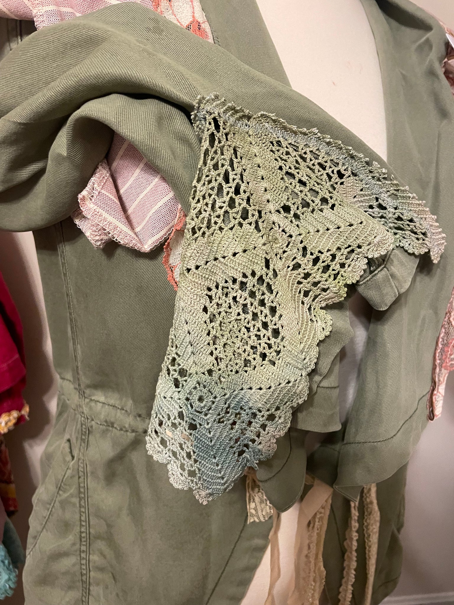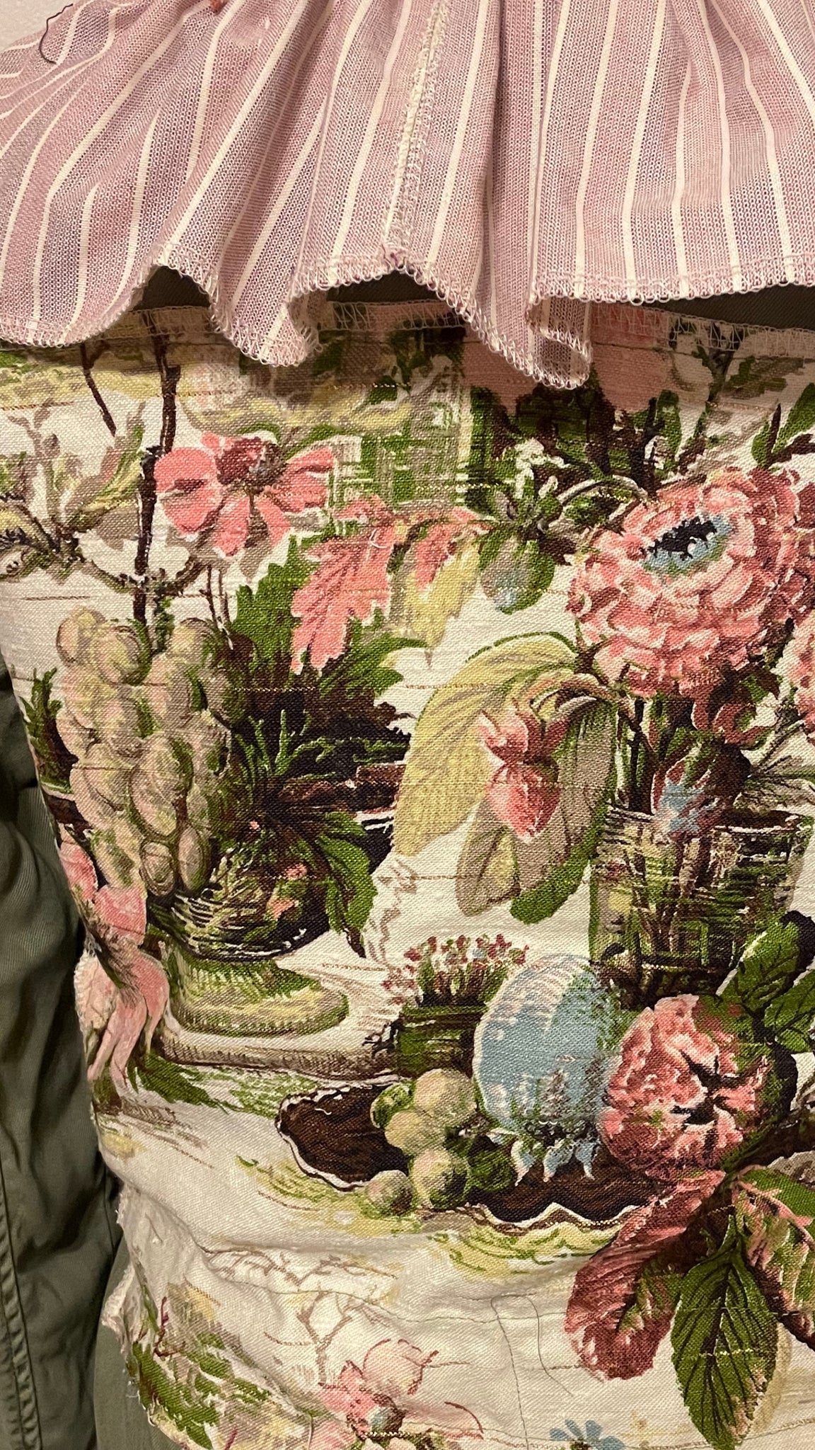 Gorgeous vintage drapery panel features fruits and florals + a lightweight army drab green jacket. An exaggerated collar from the hem of an upcycled men's oxford cloth shirt. The cuffs have asymmetric hand-dyed lace for added drama.