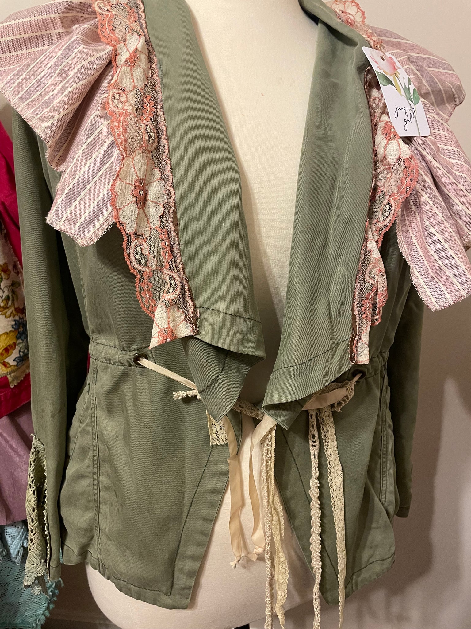 Each item is made from a variety of materials - for recommended care: Your one-of-a-kind JG threads apparel will arrive ready-to-wear and finished with a spritz of starch & lavender. Hand wash or delicate cycle only – vintage linens are so delicate and the mix of newer & older fabrics & flannel or denim can end up muddied or damaged when washed on a regular cycle. Line or hang dry, iron as you like, giving care to the delicate lace and mismatch of fabrics. Junquey Gal apparel is not stuffy and equally as pleasing when a bit casually rumpled!