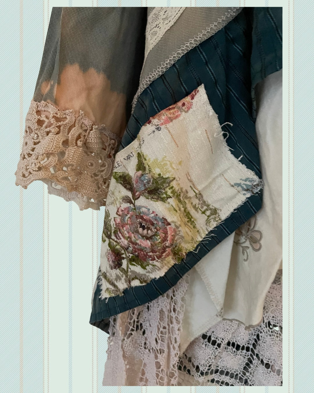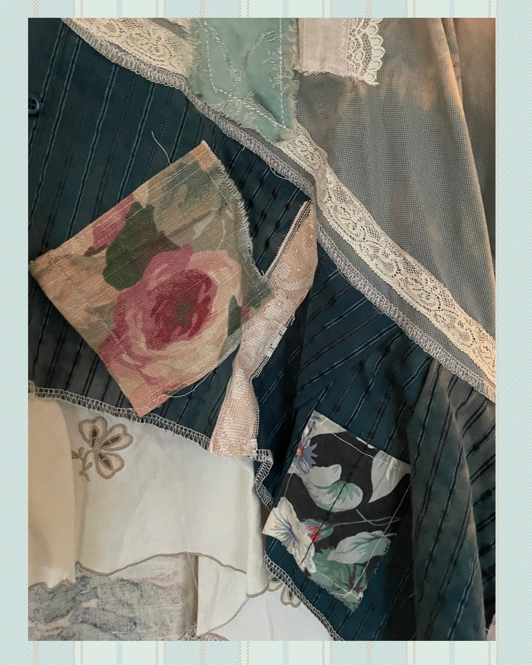 Each item is made from a variety of materials - for recommended care: Your one-of-a-kind JG threads apparel will arrive ready-to-wear and finished with a spritz of starch & lavender. Hand wash or delicate cycle only – vintage linens are so delicate and the mix of newer & older fabrics & flannel or denim can end up muddied or damaged when washed on a regular cycle. Line or hang dry, iron as you like, giving care to the delicate lace and mismatch of fabrics. Junquey Gal apparel is not stuffy and equally as pleasing when a bit casually rumpled!