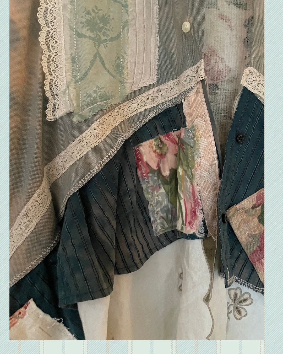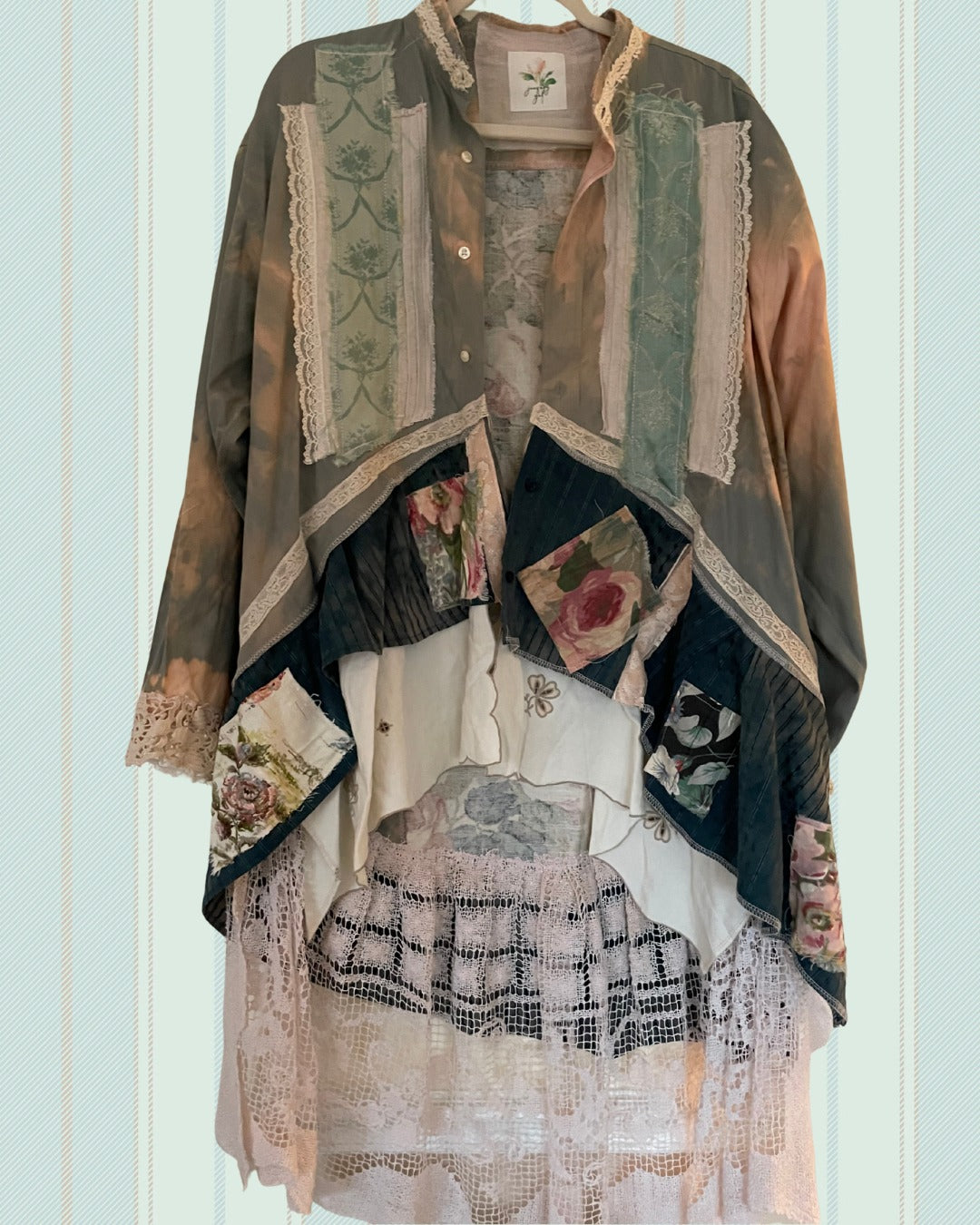 Dusty bleach dyed men's dress shirt, dramatic angle at the front waist for a flattering high-low fit, added length from delicate filet lace for movement, and vintage fabric swatches for interest. The brocade damask satiny fabric on both sides of the chest is from a sun-faded drapery panel.