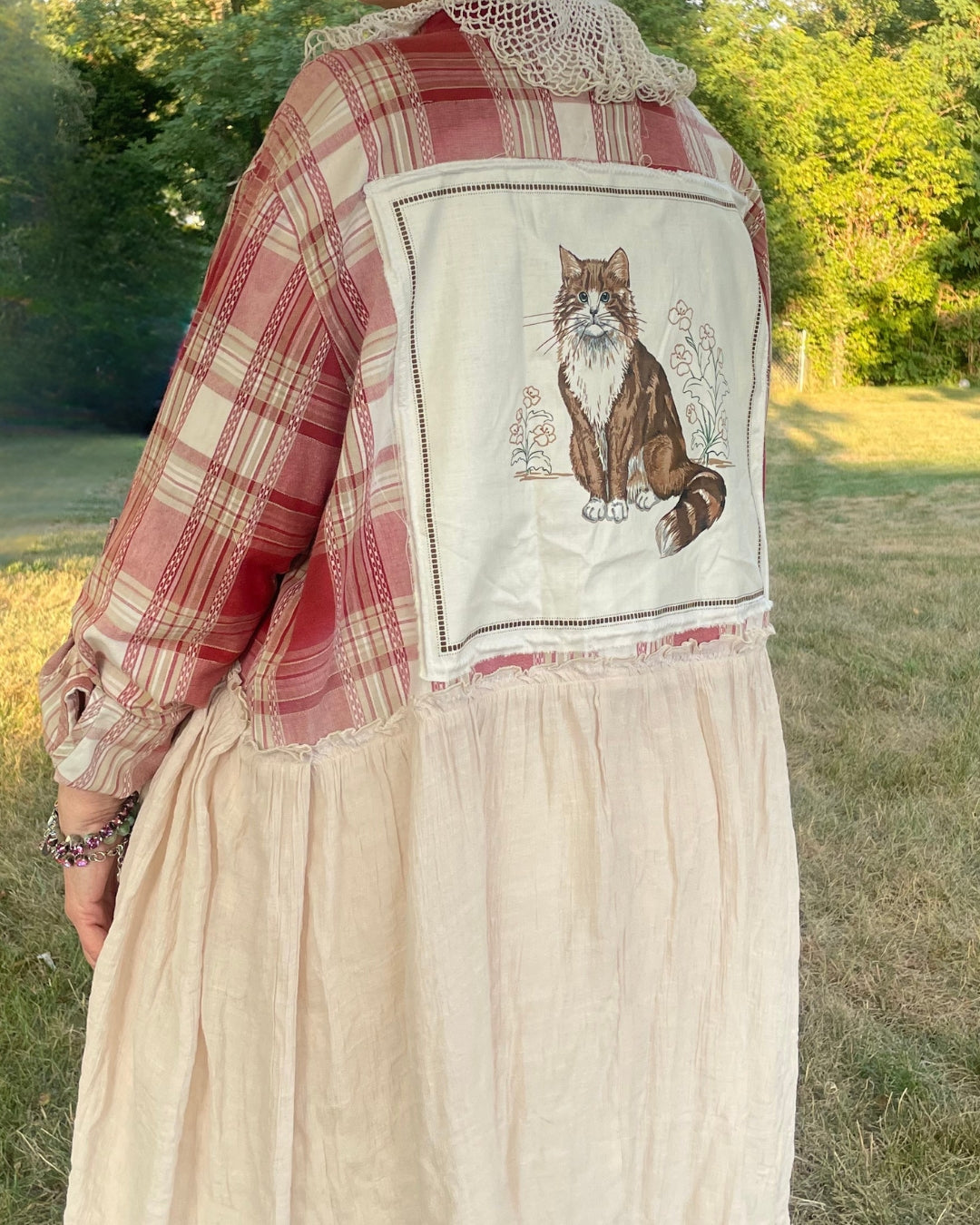 Fabulous calico tabby kitty fabric panel was once destined for a throw pillow or quilt square, but it has been elevated to a fabulous accent on this flowy duster. Light weight cotton jacket has been given an empire high-low waist of gauzy light weight fabric.