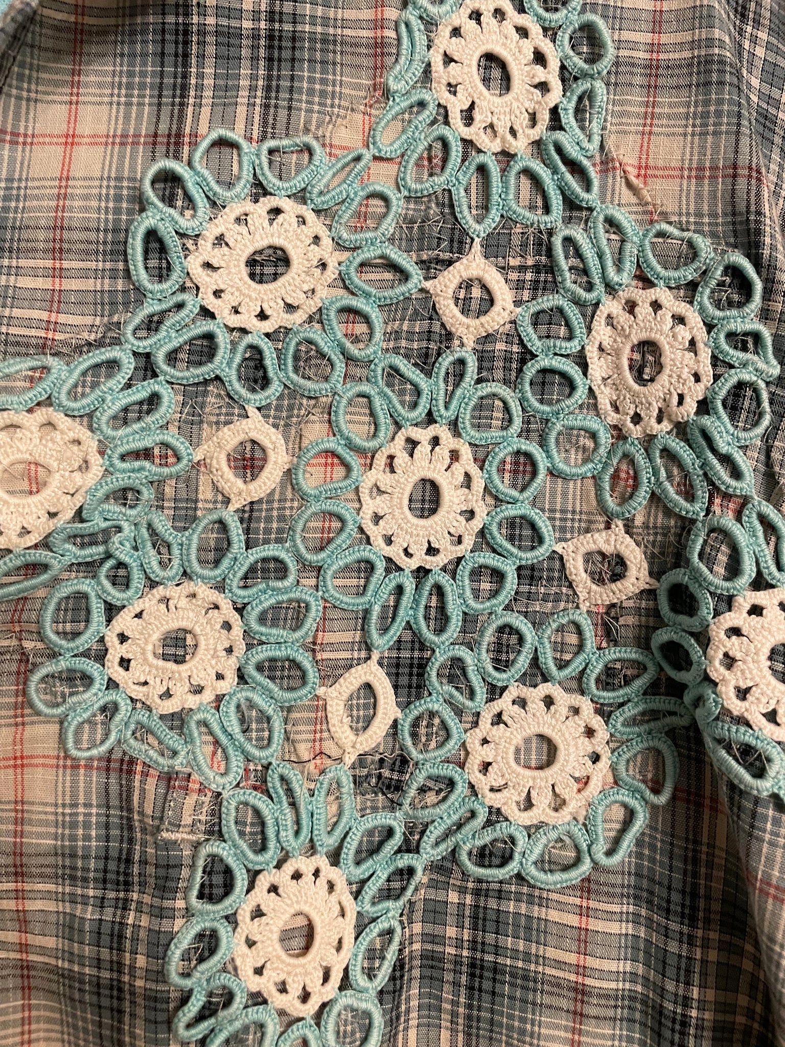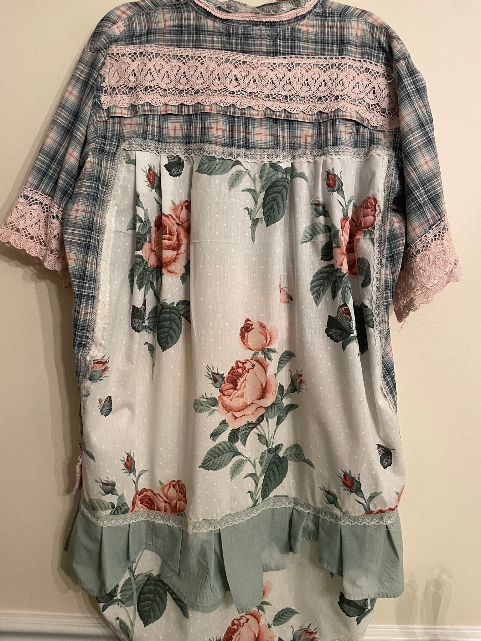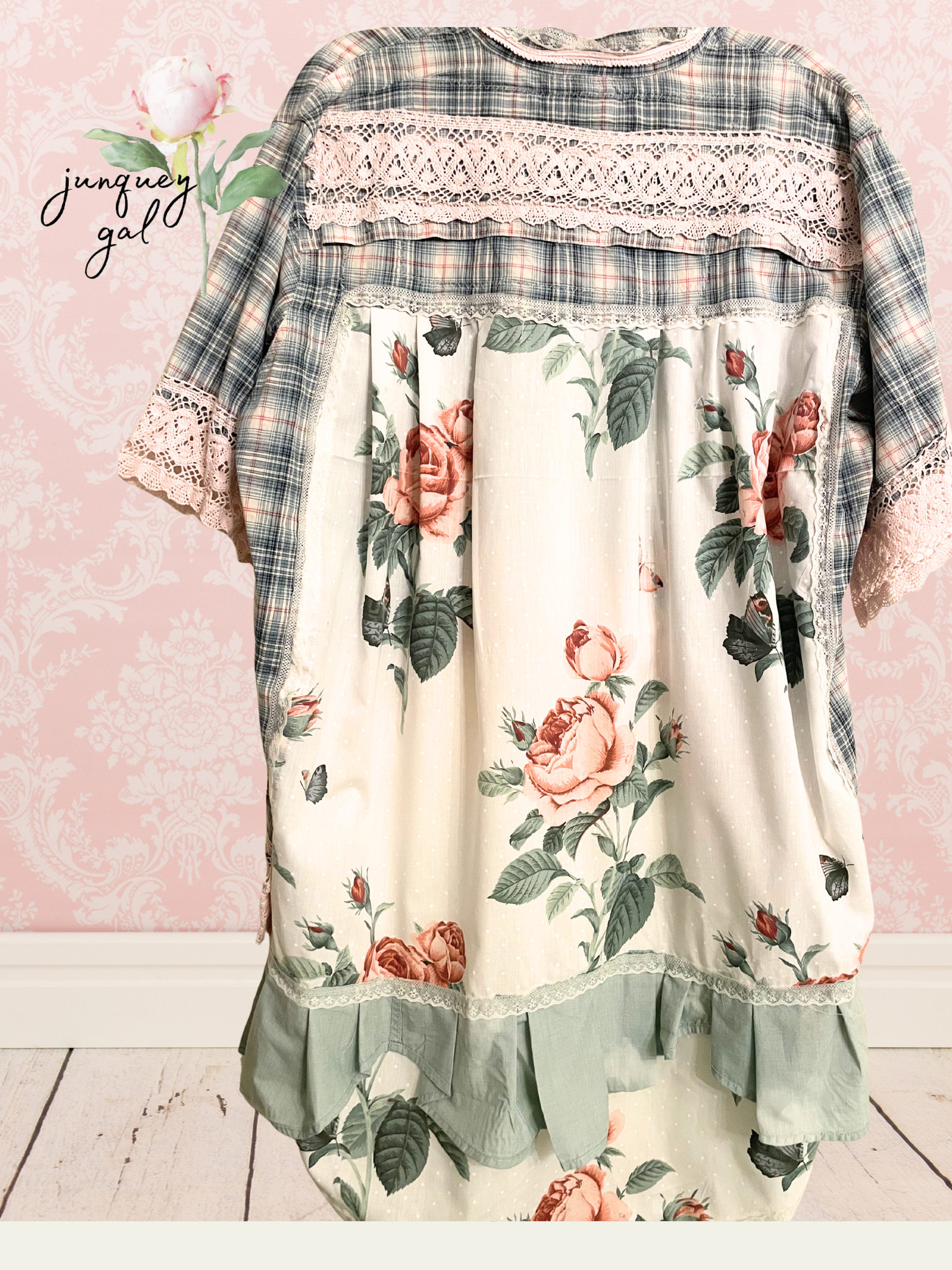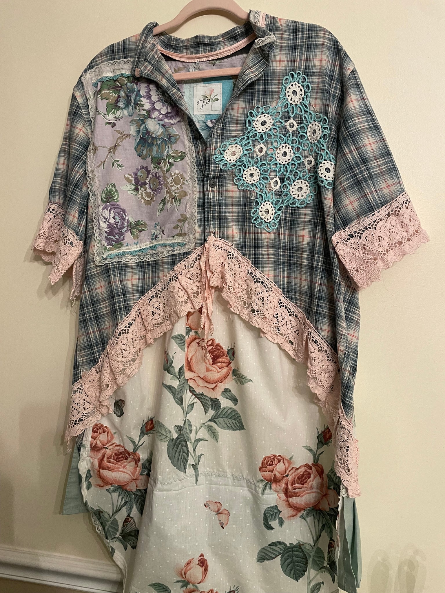 Each item is made from a variety of materials - for recommended care: Your one-of-a-kind JG threads apparel will arrive ready-to-wear and finished with a spritz of starch & lavender. Hand wash or delicate cycle only – vintage linens are so delicate and the mix of newer & older fabrics & flannel or denim can end up muddied or damaged when washed on a regular cycle. Line or hang dry, iron as you like, giving care to the delicate lace and mismatch of fabrics. Junquey Gal apparel is not stuffy and equally as pleasing when a bit casually rumpled!