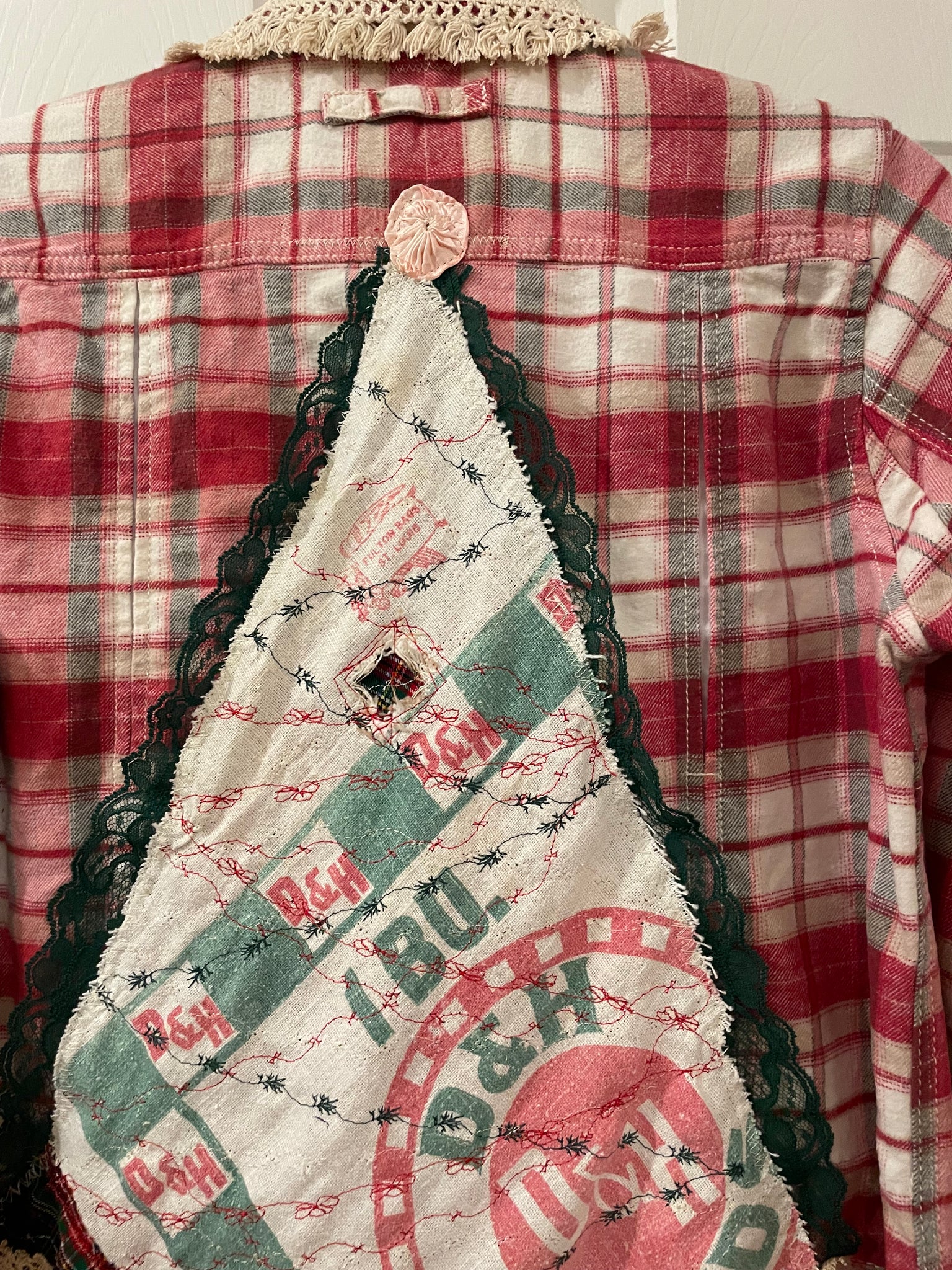 Featuring authentic vintage feedsack & ecru crochet lace & fringe, this is a medium weight flannel, in dusty pink and reds and upcycled into a flattering high-low silhouette. The shirt is well-made with ease vents in the back and arms for a more comfy fit. The Christmas tree design celebrates the holiday season with sustainable style with nostalgic charm from the great seed sack bad. Each piece tells a story of resourceful craftsmanship, transforming classic textile heritage into a wearable tribute to holiday tradition. Perfect for those who appreciate quality fabrics with genuine character and environmental consciousness.